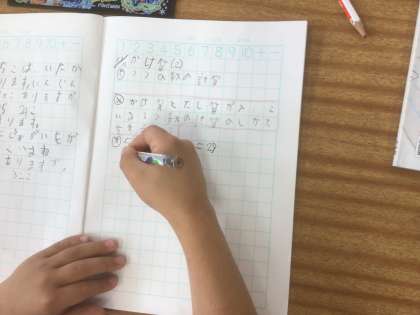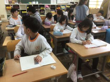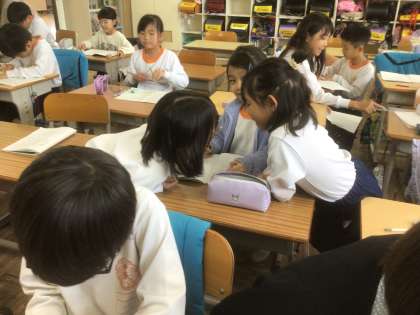 11/11の授業では、文章題の読み、かけ算とたし算が合わさった式を立てました。次に、その解き方について考えました。あちこちで教え合う姿が見られました。