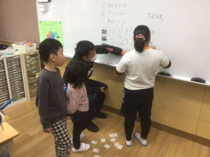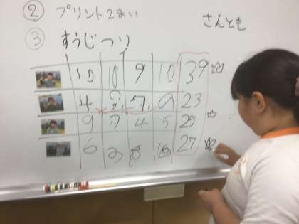 特別支援学級2〜4年生の算数では、数字釣りゲームを行いました。釣りあげた得点を表に表し、たし算をして順位を出しました。