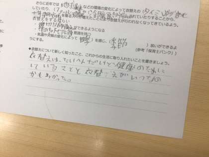 11/11の学習では、快適な冬のくらしのために衣替えが大切であることを学びました。授業の最後に、これからの生活に取り入れたいことを考えて書きました。
