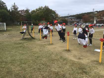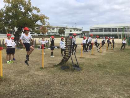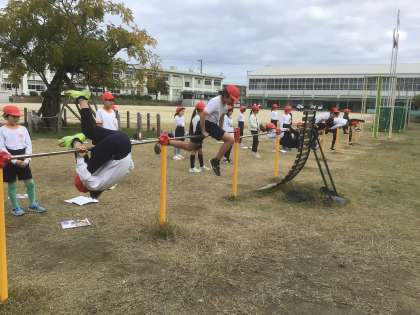 鉄棒は、「かかえこみ前回り」「後方かたひざかけ回転」「逆上がり」などの技に取り組んでいます。11/12の授業では、ここまでの練習の成果を発揮して、児童がクルクルと回っていました。