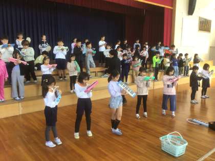 児童はひな壇に並び、大きな声で歌い、鍵盤ハーモニカや打楽器で演奏しました。