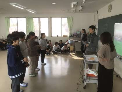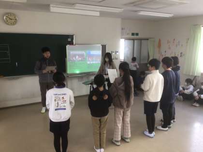 11/17の授業では、教室を舞台に見立てて、発表スライドに合わせて学んだことを発表する練習をしました。