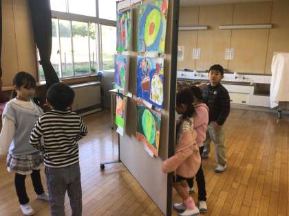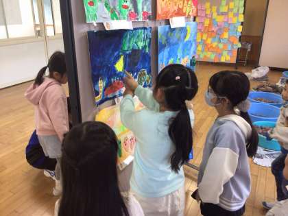 11/27の授業では、読書感想画鑑賞会を行いました。まず、自分の「みてみて」ポイントをワークシートに書いてから、お友だちの作品の鑑賞をしました。「〜さんのやさいがノリノリでたのしい」などと書いていました。
