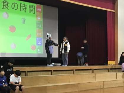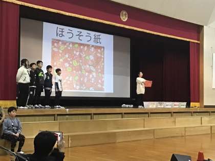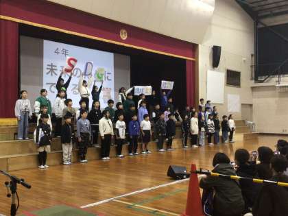 4年生は、授業で学習したSDGsの17個の目標かた、様々な環境問題について発表しました。ゴミ処理問題、プラスチックゴミ問題、食品ロス問題などを、クイズ問題をおり混ぜながら発表しました。未来の地球を守るために4年生の自分たちでもできることをしようと訴えました。