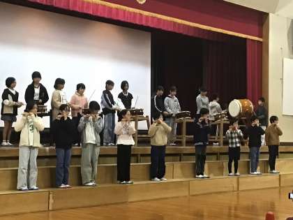 3つ目は「祭囃子」。児童が横笛、小太鼓、大太鼓を使ってお囃子を披露しました。