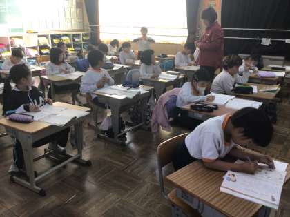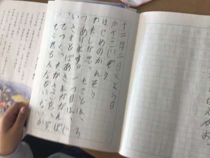 12/2の授業では、かさこじぞうのお話を聞いた最初の感想を書きました。「じいさまはやさしいな」「おじぞうさんがおかえしを、もってきたところがよかった」などと、書いていました。