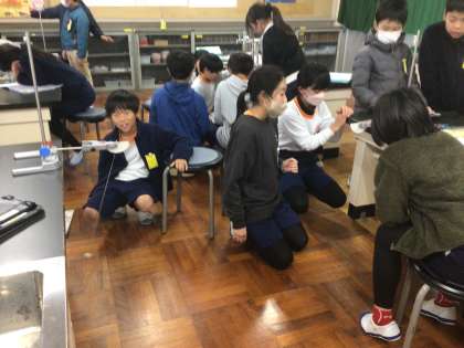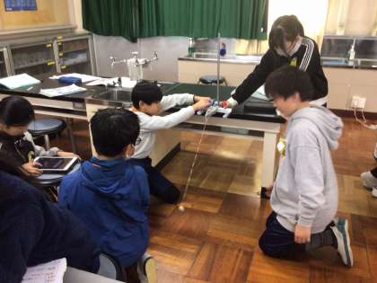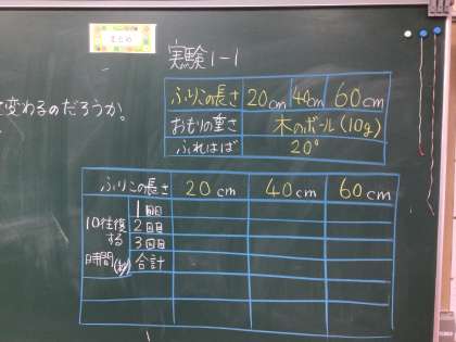12/3の授業では、「ふりこの1往復する時間は、何の条件によって変わるのか」という学習課題を立てて学習しました。ふりこのおもりを10g、振れ幅を20度に固定し、ふりこの長さを、20cm、40cm、60cmと変えた時の、10往復する時間を計測しました。