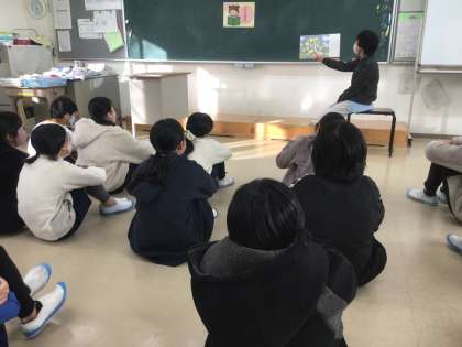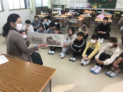 読み聞かせサークルふむふむさんが、絵本を読みながら、児童に話しかけてくださいます。児童は、ふむふむさんの問いかけに反応して、お話の主人公について話をしていました。