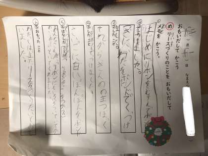 1年生の国語では、「思い出してかこう」を学習しています。これまでに、生活科で作ったクリスマスリース作りを思い出して、「したこと1」「したこと2」「したこと3」「思ったこと」などをメモにまとめました。