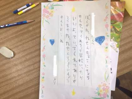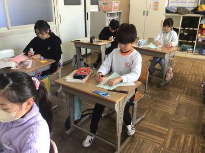12/18の授業では、家族や友達にありがとうを伝えるお手紙を書きました。手紙が書けたら、色紙で封筒を作りました。