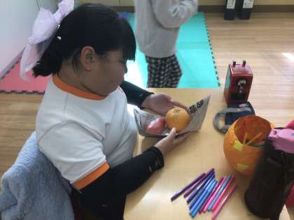 先生の説明を聞いたり、設計図を見たりして理解しながら、折りました。出来上がったお皿に、模型の果物を入れて見ました。