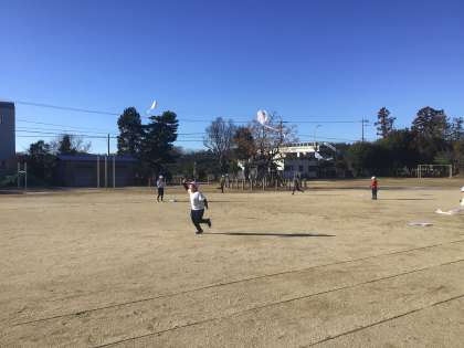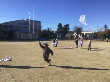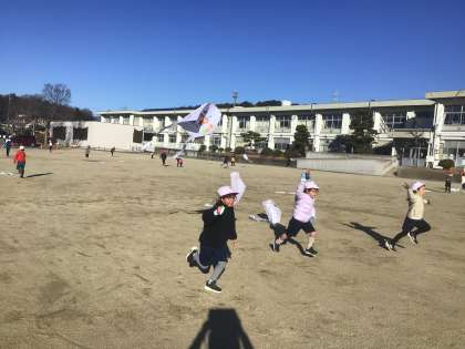 1/9は、自分が作ったたこを使って、運動場で凧上げを行いました。あいにくの微風でしたが、児童が勢いよく走ると、澄み切った空に手作り凧が上がりました。