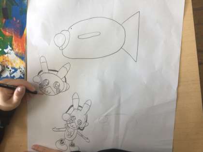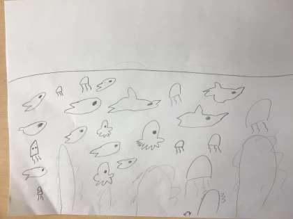 1/14の授業では、児童が想像した冒険の世界の下絵がきをしました。児童は、海の中や森の中、動物の王国などを描きました。