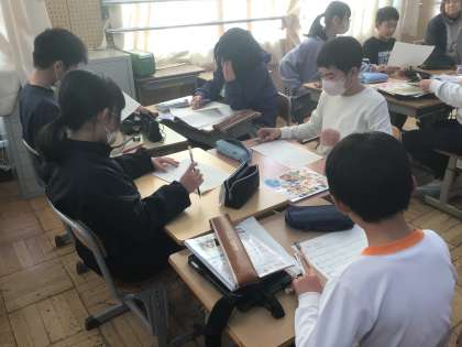 曲を鑑賞して、ふるさとへの思いが伝わるような歌い方を考えました。児童は、ワークシートに強弱記号やクレッシェンドなどを書き込みました。続いて班になってお互いの歌い方の工夫を話し合いました。