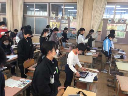 最後に一つの班が提案した歌い方が書き込まれた楽譜を見ながら、全員でふるさとを合唱しました。一部の児童が下のパートを歌ったため、綺麗なハーモニーとなっていました。