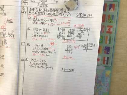 1/21の授業では、25%引きで買うと15000円になるプリンターのもとの値段を求めました。児童は図を書き、もとの値段の何倍かを考えて解いていました。