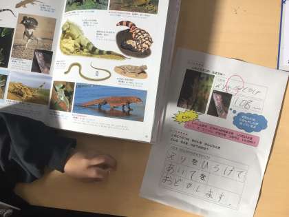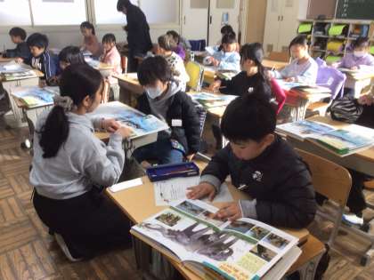 続いて動物クイズワークシートに挑戦しました。ラッコ、ゾウ、エリマキトカゲについて、図鑑を使って調べました。児童は目次や索引を使って目的のページを開き、写真や絵、説明文から考えて、クイズに解答していました。