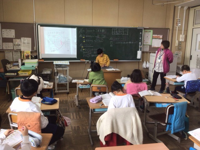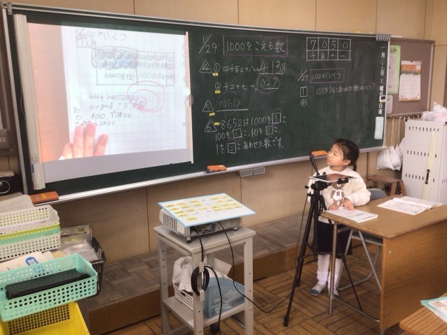 1/29の授業では、100を24こ集めた数はいくつかを考えました。児童はノートに100を10このたばにした絵などを描いて、説明できるようにしました。自分の考えを、全体に発表しました。