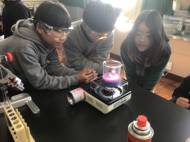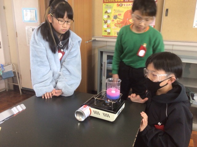 2/9の授業では、温度によって色が変化する「示温インク」を熱して、水の温まり方を調べました。はじめ青色だった示温インクは、熱すると鮮やかなピンク色に変わりました。児童は、「火が当たっている部分から色が変わった」「ピンク色は、上に上がった」と、観察結果を発表していました。