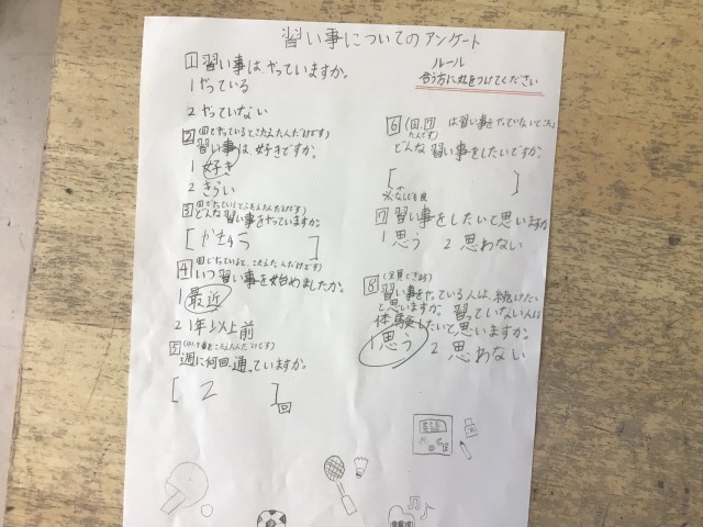 4年生の国語では、「調べたことをほうこくしよう」を学習しています。児童はこれまでの学習で、班ごとにテーマを決めて、クラス内でアンケート調査を行いました。アンケートは、「学校について」「習いごとについて」「都道府県について」などでした。