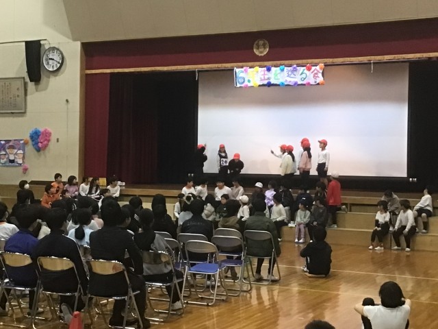 伝統芸能の棒の手を学んだ授業を再現し、伝統芸能クイズをしました。また、縦割り班活動でやさしく跳び方を教えてくれた場面を再現しました。最後に2年生は、6年生を囲んでダンスを披露しました。