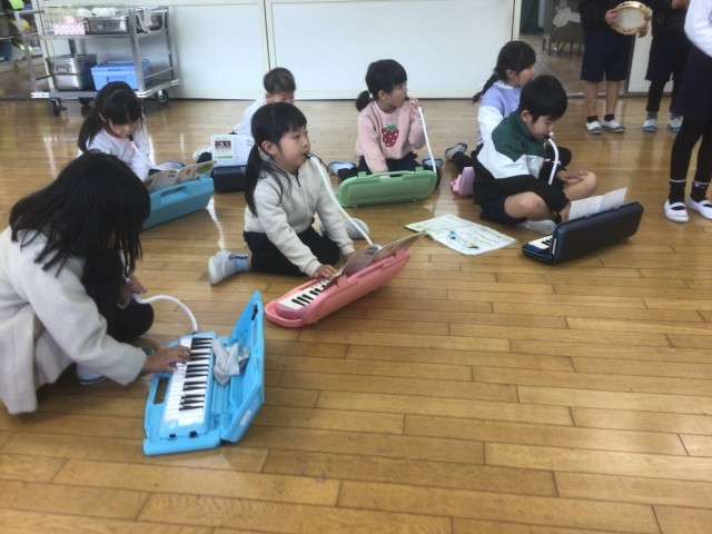 3/6の授業では、鍵盤ハーモニカ、カスタネット、タンブリン、鉄琴、トライアングル、すずの6つの楽器を使って合奏を楽しみました。
