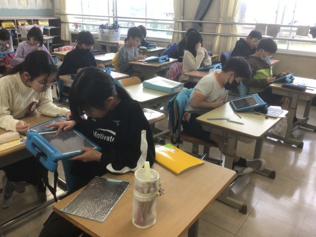 3/6の授業では、副読本「豊田」に載っている知立市のおまつりについて、動画を見ました。5tもある山車を引く、勇壮な人々の姿に、児童は引き込まれていました。「豊田市は・・・」と考え、さっそく学習用タブレットに「豊田市 まつり 山車」と打ち込んで調べていました。