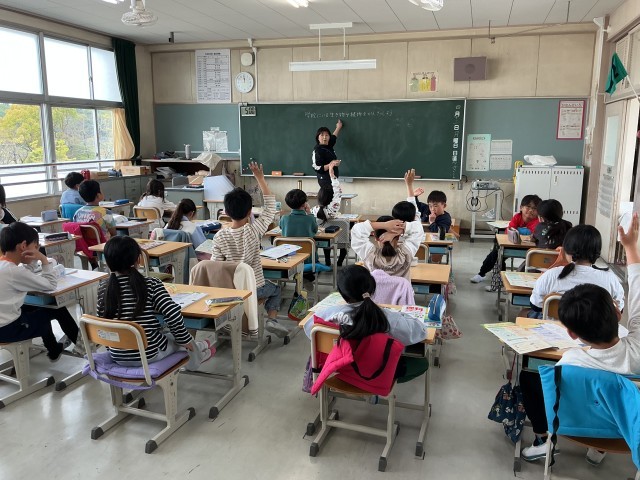 4/13は、3年生が初めての理科を勉強しました。児童は、伊保小学校の運動場や畑にいる生き物を考えて、発表しました。