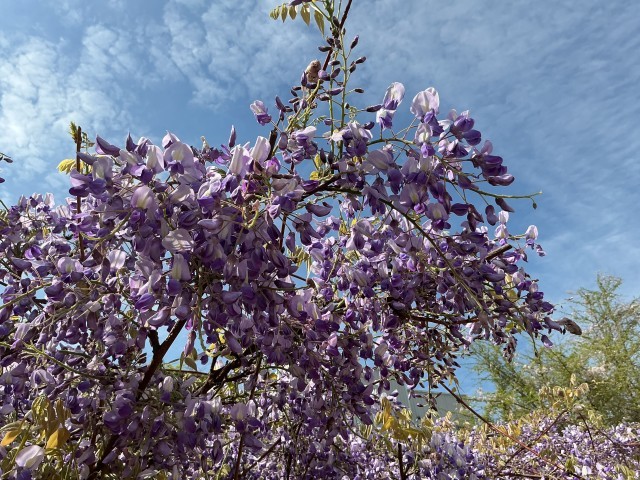 4/14現在、一番東の藤の花が満開となっています。3本の藤はそれぞれ種類が違っており、東から西にかけて、順番に花が咲いていきます。