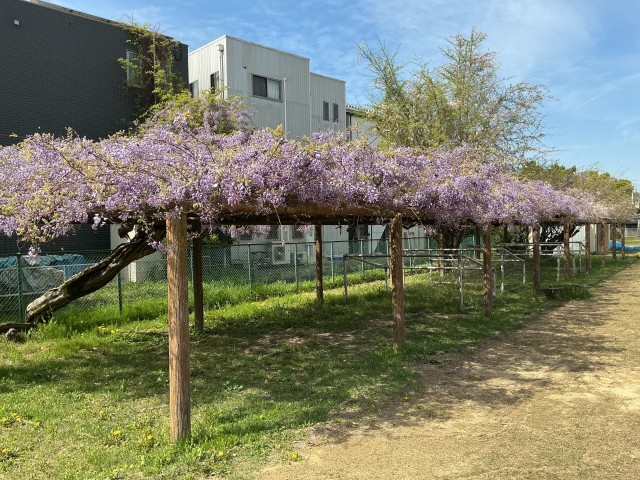 伊保小学校には藤棚があり、3本の藤の木が植っています。美しい藤の花は、本校のシンボルツリーである「せんだん」とともに本校の校歌にも歌われています。