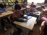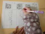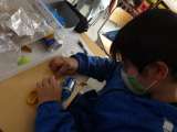 1年生特別支援学級の自立活動では、手先の動きを滑らかにするために、シール貼りと紐...