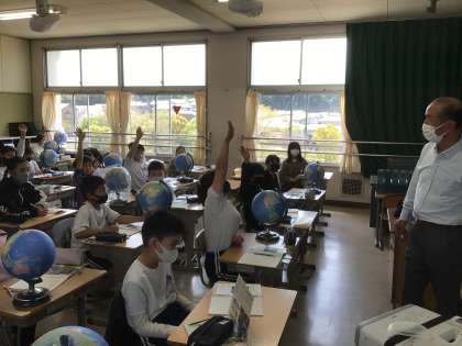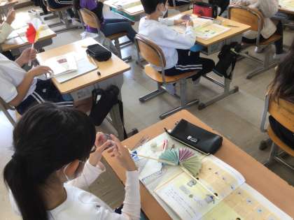 高学年の学習の様子です。4年生は、分度器の仕組みを確認して角度の学習、5年生は地球儀を使って国土の学習、6年生は対称な図形の線対称について学んでいました。
