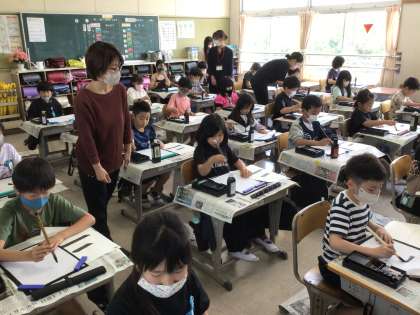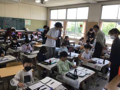 3年生書写の学習。今日も佐藤先生やたくさんのボランティアの方にサポートをいただき、毛筆に取り組みました。きめ細かな声かけのおかげで、道具の使い方、筆の動かし方等どんどん上達しています。