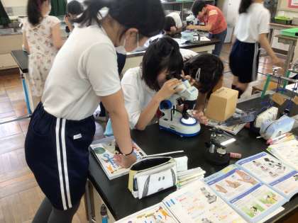 5年生理科の学習。顕微鏡を使って身近な植物などの様子を観察していました。初めて見る世界に思わず歓声があがっていました。