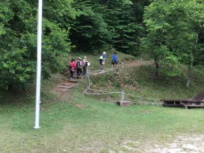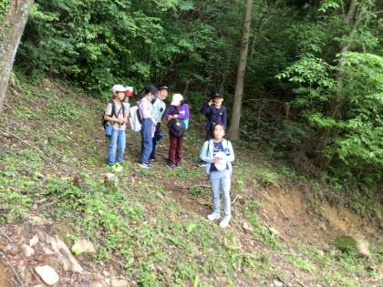 オリエンテーリング。地図を頼りに班で協力してポストを探しています。少し蒸し暑い天候ですが、みんな元気です。急な山道も声をかけあって進んでいます。