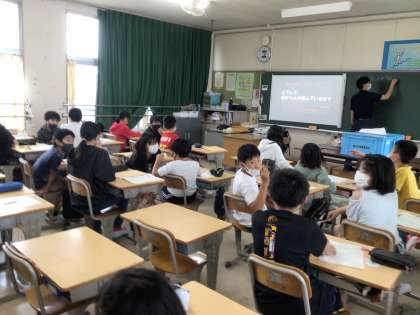 総合的な学習の時間で市木学区の歴史について学ぶ6年生が、博物館準備課の駒野先生から市木小学校の周囲にある歴史的遺産について紹介していただきました。多くの古墳があることや、市木城の現在の姿、出土品についてなど興味深い話を聞き、これからの学習に対する意欲を高めていました。