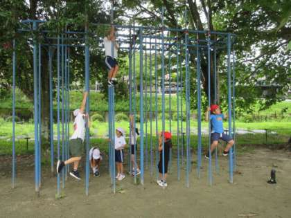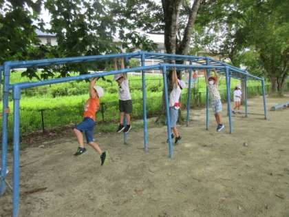 今年度、市木小学校では遊具の更新工事が予定されています。安全性を高めるため古い遊具が撤去され、新しい遊具が設置されます。古い遊具の撤去が夏休み中に行われることが決まり、これまで慣れ親しんできた遊具がなくなってしまうので、急遽現在の遊具で遊ぶ時間を設けることになりました。今日は2年生がこれまでの感謝の気持ちとともに、楽しく遊具で遊びました。