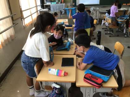 9月5日 学習の様子から 公開日 2023/09/05 更新日 2023/09/05 校長室から 子どもたちの学びを深めるために、市木小学校では「話し合い」の場を設定し、自分の意見をもち、友達の考えを聞いて考えを広げていけるように取り組んでいます。今日は3年生が学習用タブレットを活用して自分の学習のまとめを発表したり、5年生が「気づきメモ」というアプリを使って友達の意見に対する自分の感想や意見を伝えたりしていました。