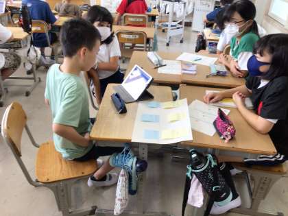9月20日 学習の様子から 公開日 2023/09/20 更新日 2023/09/20 校長室から 2年生図工の学習。はさみでいろいろな形を切り、切った形を使って想像をふくらませていろいろな模様を考え、作品を作っていました。 4年生総合の学習。講師の方とオンラインでつながり、食品ロスについて詳しく教えていただきました。 5年生国語の学習。学級の問題を解決するために、グループでの話し合いを深めていました。どのグループもしっかり発言者の意見を聞き、考えを広げていました。