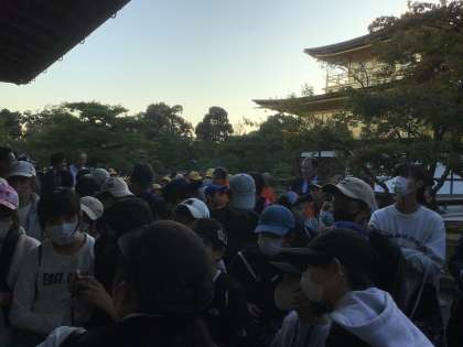 金閣寺に到着しました。夕陽に輝く金閣寺はとてもきれいでした。これから宿に向かいます。