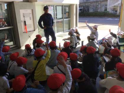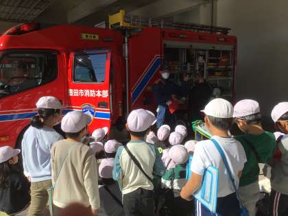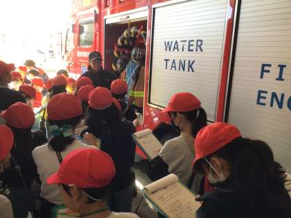 3年生が豊田市中消防署東分署を訪問し、消防署で働く人たちの仕事について聞きました。自分たちから疑問を積極的に質問し、火事を消したり防いだりするために、どのような取り組みをしているか、意欲的に学んでいました。