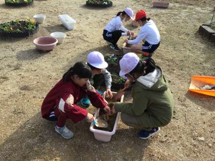 やまびこ広場では、総合的な学習の時間に花壇を作成してくれた3年生を中心に、ボランティアで活動してくれる子がいます。水やりをしたり、もっと花を増やそうと土づくりや球根を植えたりしてくれます。今日は1年生や6年生の子も手伝いに来てくれました。春に花いっぱいのやまびこ広場になるのが楽しみです。