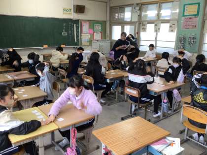 4年生国語の学習。百人一首に挑戦。楽しくゲームをしながら学んでいました。だんだん上の句を聞いて下の句をとれる子もでてきました。