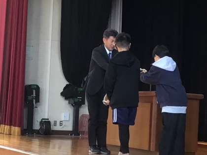 また、メジャーリーガー大谷翔平選手から贈られたグローブが学校に届いたので、その贈呈式もあわせて行いました。大谷選手からのメッセージを披露し、代表のやまびこ委員にグローブを渡しました。多くの子に触れてもらえるように、これからどのように使っていくかをやまびこ委員を中心に相談していきます。楽しみです。