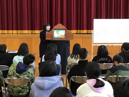 壁画家の松井エイコさんをお迎えし、「平和」について、6年生にお話をしていただきました。子どもたちと一緒に「戦争」「平和」についての考えを伝え合った後、平和紙芝居作品「二度と」を実演していただきました。頷きながら、真剣に話を聞く6年生の様子を見て、「一人一人の子どもたちの表情からにエネルギーをいただき、感動しました。」とお言葉をいただきました。子どもたちと未来の平和を願う貴重な時間となりました。