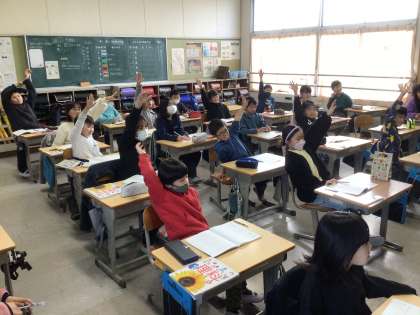 3年生理科の学習。物の重さの変化について予想を立てていました。たくさん手が挙がり、意見が出ていました。