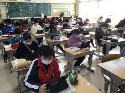 5年生国語の学習。「テクノロジー」に関する説明文を読み、その内容に対して利点や問題点などを多角的に考え、自分の意見を学習用タブレットにまとめてました。