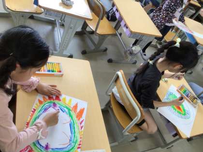 1年生は図工で、太陽の絵を描いています。色鮮やかな、さまざまな太陽が、画用紙いっぱいに描かれています。