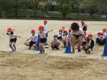 4年生は、体育で立ち幅跳びを行っていました。腕を大きく振って、タイミングよく跳ぶことで記録が伸びるそうです。