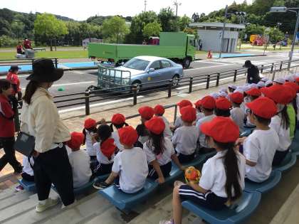 クイズで交通安全について学習した後、横断歩道や歩道の安全な歩き方の練習を行いました。